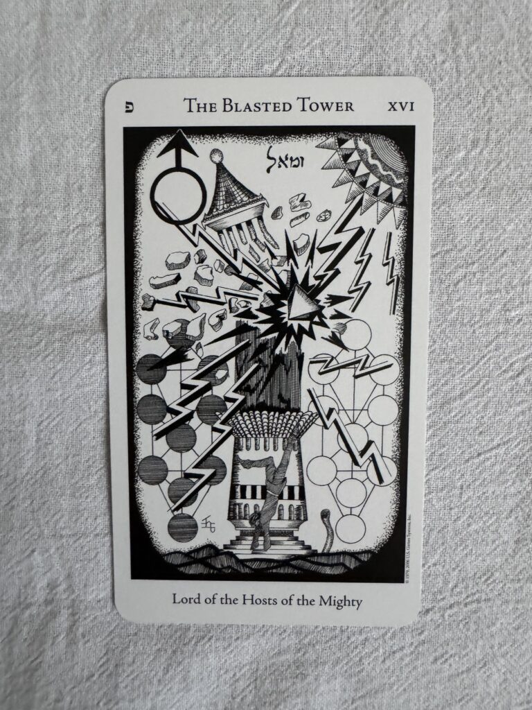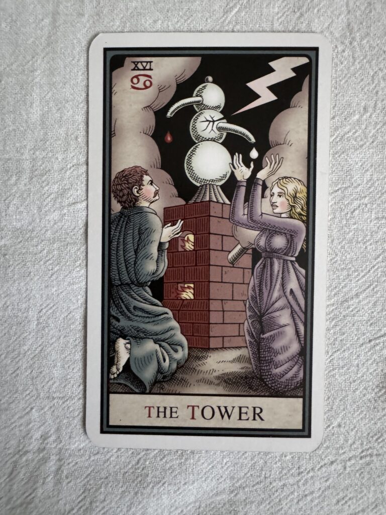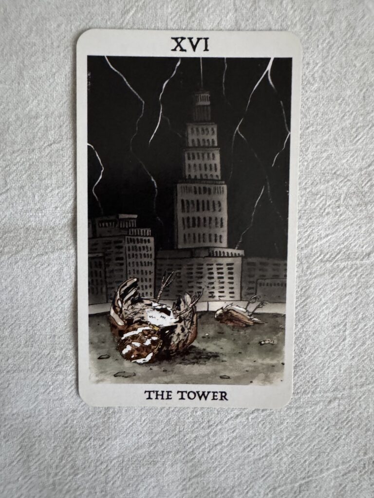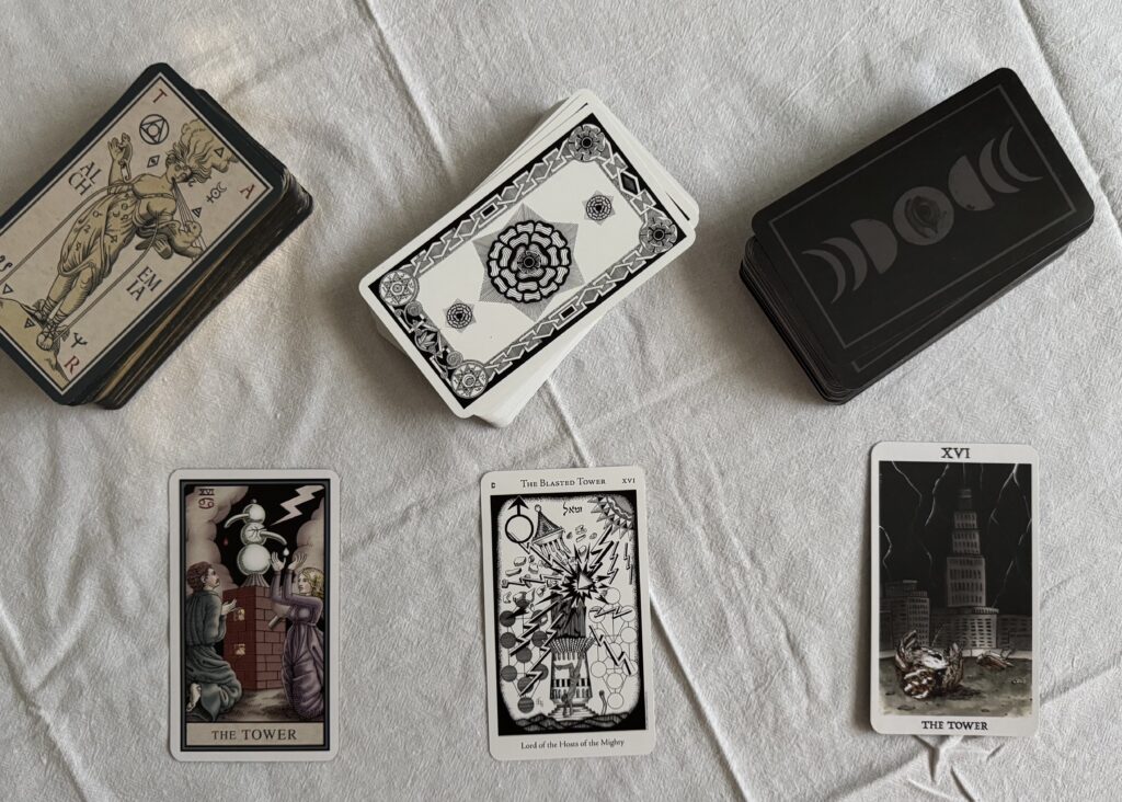 I pulled Tower cards from the Rust Belt Arcana(RBA), Hermetic Tarot (HT), and Alchemical Tarot (AT) decks, to dig a little deeper into the card influences. Each lends a different flavor to the disastrous scenes.