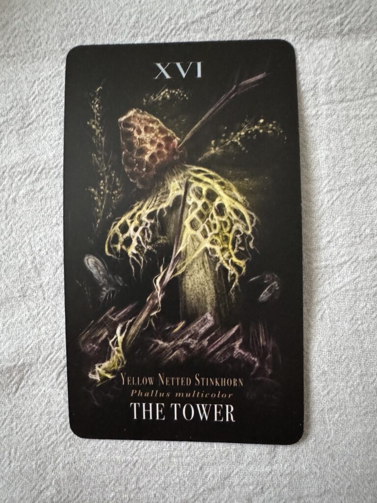 The Tower came up in my new moon reading this month and in various spreads since. Yesterday I drew cards for the Summer Solstice and what appears? The Tower. I used a lovely Midnight Magic deck by Sara Richard; each card features a different mushroom. Turning to the small guide book that comes with the deck, I learn a little bit about the stinkhorn. Richard’s readings of the fungi are brilliant: “The stinkhorn explodes from the ground with a force that can crack pavement, then decays into a horrific puddle – capturing the essence of the Tower card.”