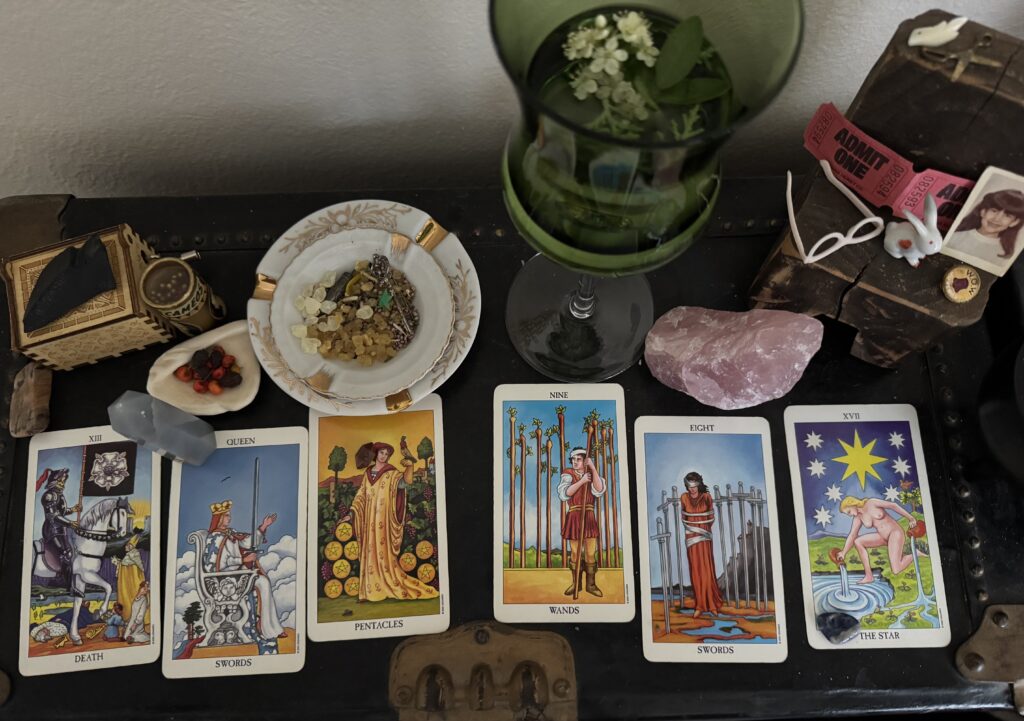 That night under the darkest sky, I turned to the cards and read them as I wept. Yes, death is surely arriving. I would be guided toward a vision of clarity and this happened, too. A dear friend reminded me that I had time to prepare for what was coming. She suggested I focus on gathering the resources necessary to assure Xotichil’s peaceful transition. I also talked my neighbor, a former hospice nurse. He advised me to make the most of my time with my familiar. He spoke as if he were the Queen of Swords himself, “Put your grief on a shelf, now is the time to take care of business – you can be sad once she’s gone.” These conversations helped me. I started building an altar to honor the unconditional love we’ve shared for nearly 10 years. I resolved to fill her days with as much pleasure as possible: cuddles, beefy bones, cheese, and slow sniffy walks. There has been and will be plenty of writing.