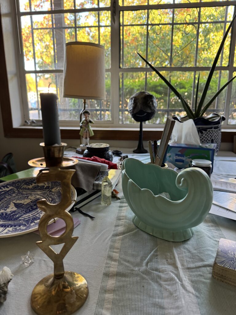 The blue shell holds my folded wishes. In the foreground: a newly acquired vintage AQUARIAN TAROT deck and a candle for joy to guide me in crafting my wishes. In the background? Familiars: Spike the Succulent, Casebeer’s UR (2025). They are attending an array of assistive objects and some junk mail. Sometimes, magic happens in the kitchen!